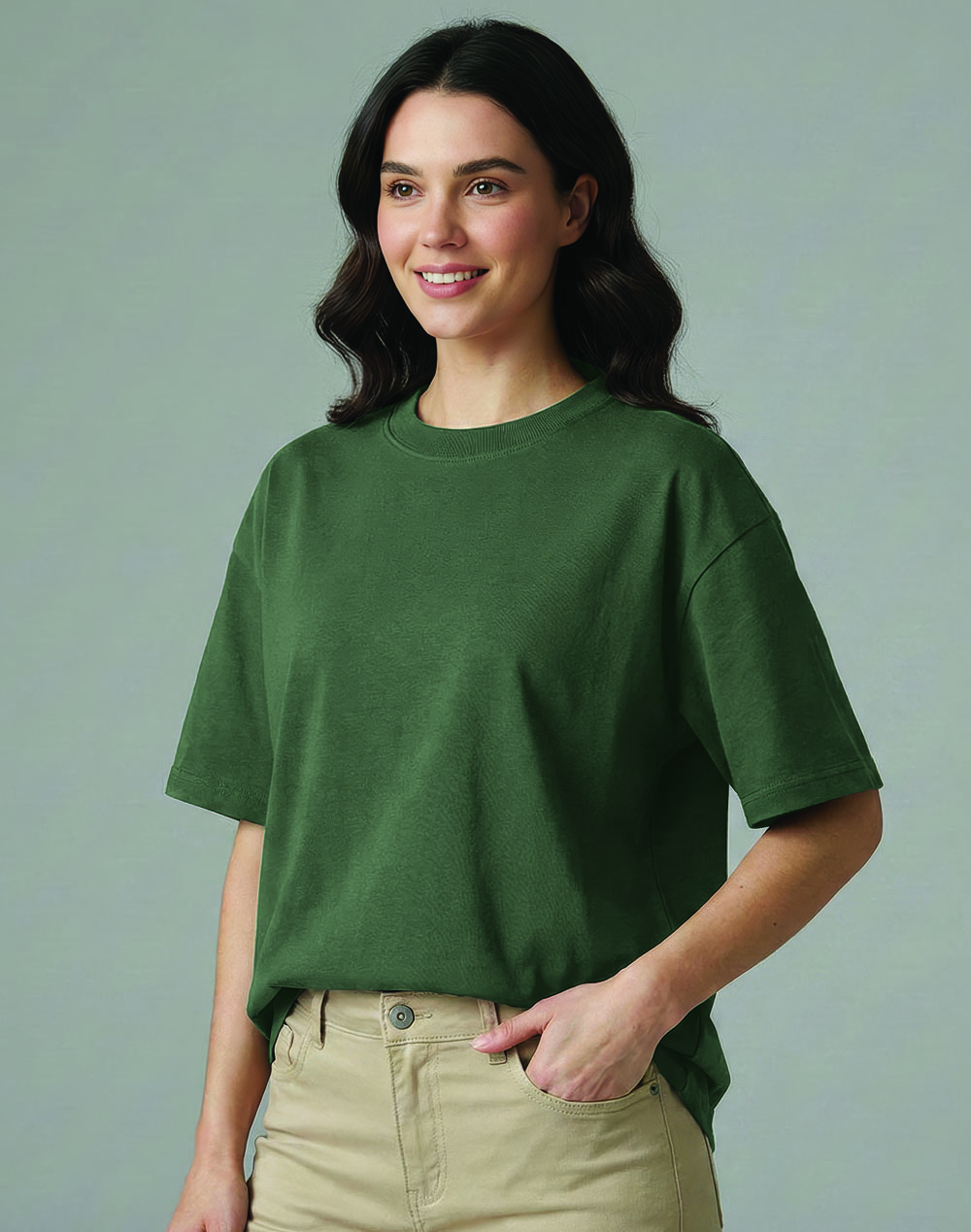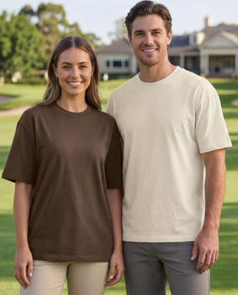 Short body, dropped shoulders, neck ribbing, side seamed, shoulder to shoulder tape, double needle hems, preshrunk to minimise shrinkage