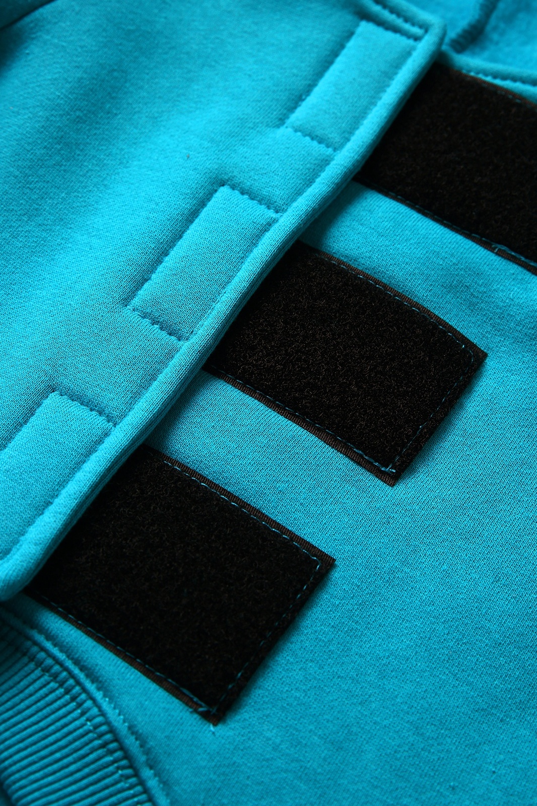 The back of the hoodie features an opening secured with Velcro, allowing it to wrap around and fasten under the dog's belly with adjustable support